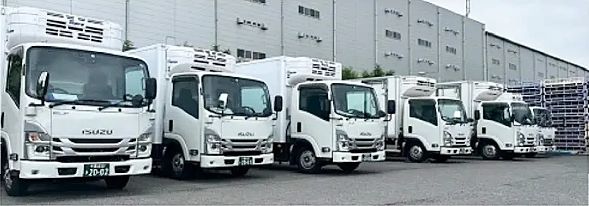 簡易二層式車両を導入しており、冷凍帯・チルド帯の同時配送をしております。